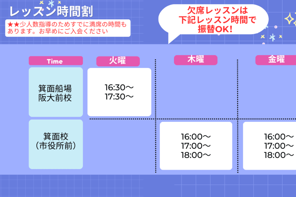 毎週火曜日 ・16:30~17:20(50分) ・17:30~18:20(50分) 毎週土曜日 ・10:00~10:50(50分) ・11:00~11:50(50分) ・12:00~12:50(50分) ※各定員6名 ◆振替について◆ レッスンの振替は可能です。 他教室(箕面校・千里中央校)へもお振替いただけます。 |