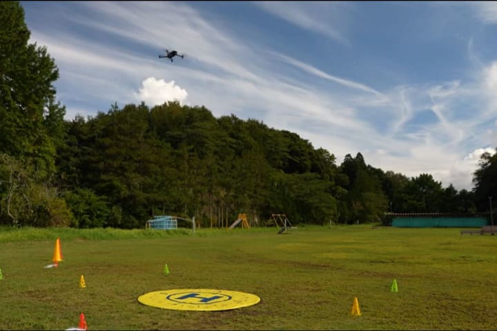 使用ドローン「プロドローン社PD6D-TYPE3」、場所:コードベース君津(廃校を利用した施設)の教室、運動場を利用した。