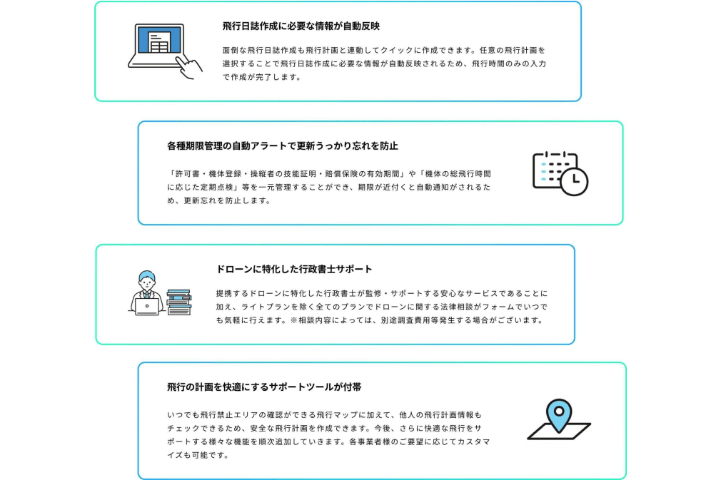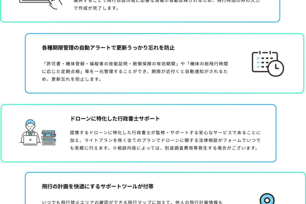 さらにドローンに特化した行政書士のサポートが付いているので、安心した運用が可能となります!