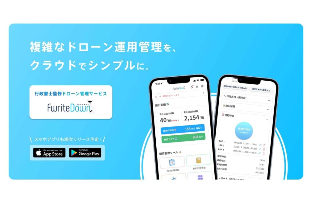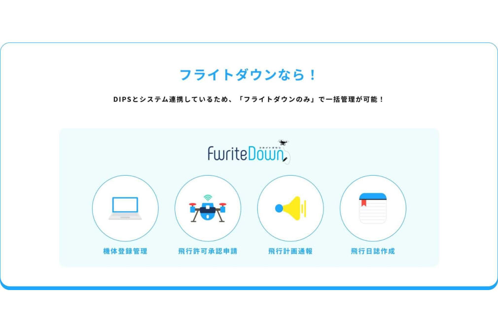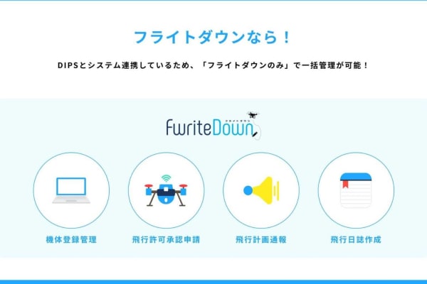 FwriteDown(フライトダウン)は、Paix Avi株式会社が開発・提供するドローン運用サポートサービスです。DIPSで行っていた「機体管理・飛行許可承認申請・計画通報」や