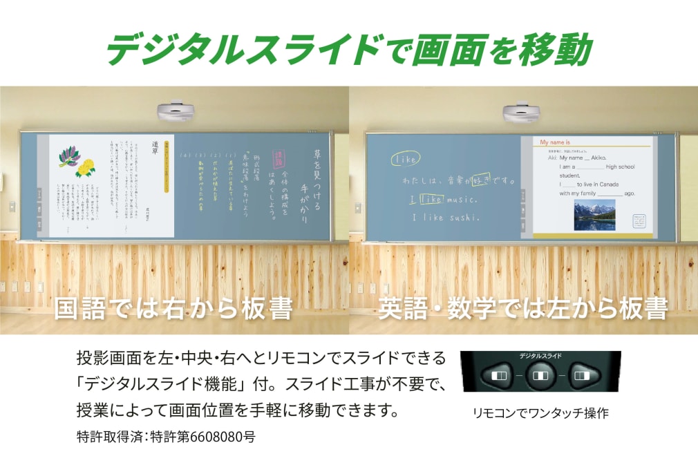 ワイードを黒板の中央に設置するだけで、投影画面をリモコン操作で左・中央・右へとスライドできる、「デジタルスライド機能」付。プロジェクターをスライドさせる為に大きなスライドレールを取付ける必要はもうありません。