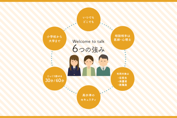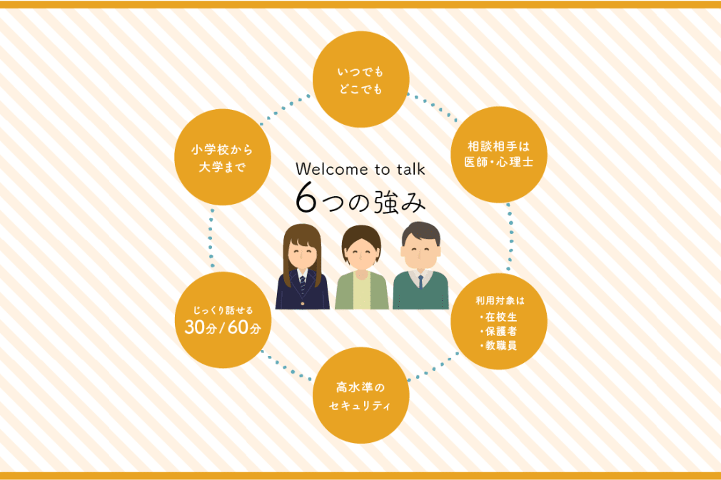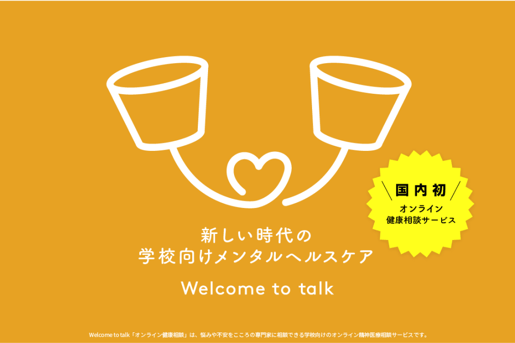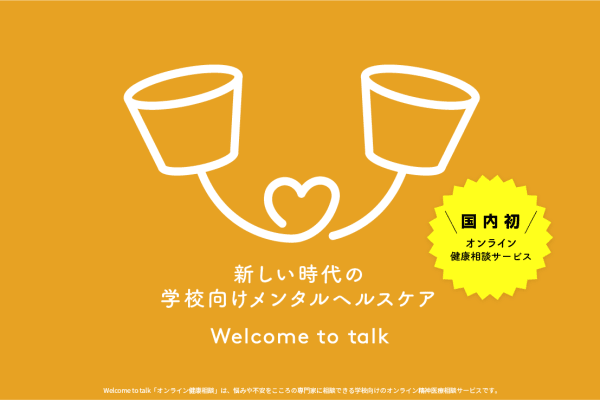新しい時代のメンタルヘルスケア、Welcome to talkオンライン健康相談サービスは、教育機関に特化した国内初のメンタルヘルスケア。学校場面におけるメンタルヘルスに関する課題を専門家によるオンライン相談で解決します。