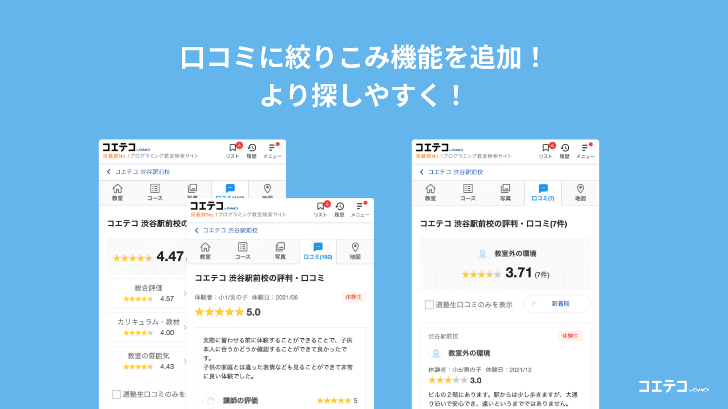 こんにちは、コエテコ編集部です!教室、スクールに掲載されている口コミが探しやすく、そして見やすくなりました!口コミの絞り込みや、並び替えができるようになり、気になるスクールや教室の評判が簡単に探せるようになっています✨コエテコでは、現在、国内でNo.1の口コミ数を保持しています👑より多くの方が、見たい口コミを探せるように、これからもアップデートを続けてまいります!😚口コミをみて、「気になる!」と思った教室は、ぜひ足を運んでみてくださいね!👍