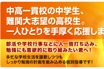 高校受験、中高一貫校の内部進学、定期テスト対策、難関大学受験対策など、中学生から高校生の多様なニーズに応える個別指導コースです。個々の目標達成に向けた最適な学習計画を立案し、プロ講師がきめ細かく指導。部活動と両立しながらでも、効率的に成績向上と志望校合格を目指せる柔軟な指導体制が特徴です。苦手科目の克服も手厚くサポートします。