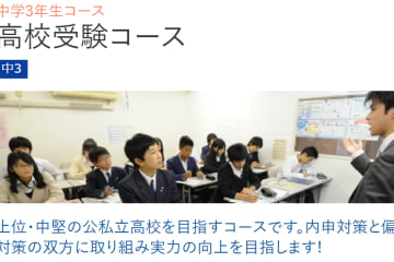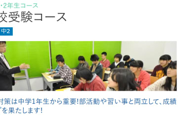 中学1年生の高校受験コースでは、部活動や習い事と両立させながら、成績向上を果たせるよう総合的な指導をしています。特に定期テスト対策は内申対策の上で非常に重要になってきますので、テスト3週間前からテスト対策(テストレ)を行います。さらに各中学校の定期テスト分析データを元にした、きめ細かい指導を行っています。 中学2年生からはさらに学習内容が難しくなります。定期テスト対策はもちろんのこと、講習会での総復習や、入試を前提とした難易度の高い問題にも挑戦していきます。講習会では偏差値10アップを合言葉に実力アップを目指します。また、受験準備学年として早期の志望校決定に向けたアドバイスを実施しています。